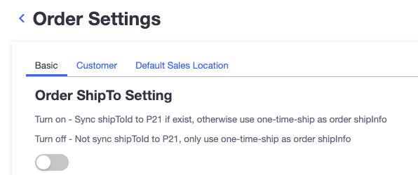 Option Description Turn ON Automatically sync addresses from ShopHyve to your eCommerce store based on the pre-defined condition (specific P21 Address field value). Turn OFF Sync all addresses from ShopHyve to your eCommerce store without any filter conditions. -